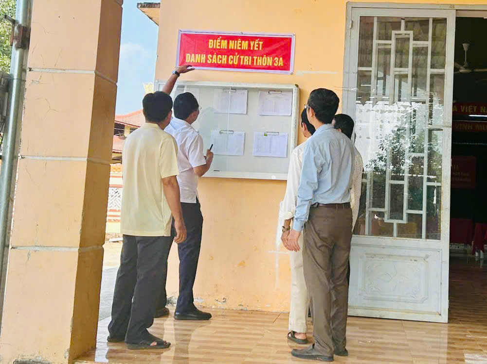Thực hiện các quy định của pháp luật về bầu cử và nhằm bảo đảm công tác niêm yêt danh sách cử tri được thực hiện đúng quy định, công khai, minh bạch, tại buổi công tác, đoàn đã kiểm tra về việc thực hiện công tác niêm yêt danh sách cử tri tại theo đúng thời gian, địa điểm quy định; điều kiện cơ sở vật chất phục vụ việc niêm yết. Đồng thời, đoàn cũng nghe các thôn thông tin nhanh công tác chuẩn bị cho cuộc bầu cử Quốc hội và đại biểu HĐND các cấp nhiệm kỳ 2026 – 2031.