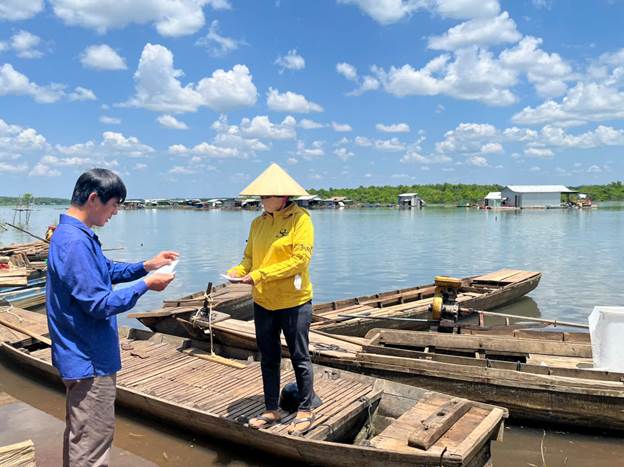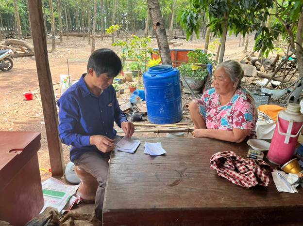 Ông Lục Văn Hiến, Bí thư Chi bộ thôn Bù Tam, Tổ trưởng Tổ bầu cử số 03 phát thẻ cử tri đến các hộ dân sinh sống tại lòng hồ thủy điện Cần Đơn